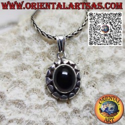 Im Zentrum des Anhängers befindet sich ein natürlicher ovaler Onyx, der von eleganten zylindrischen Elementen umrahmt wird, welche die Form betonen und dem Schmuckstück eine besondere Note verleihen.