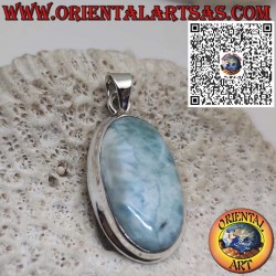 Wunderschöner Silberanhänger mit großem ovalem natürlichem Larimar-Cabochon. Der Larimar, auch als Karibik-Stein bekannt, ist selten und wird wegen seiner faszinierenden Blautöne geschätzt, die an das tropische Meer erinnern.