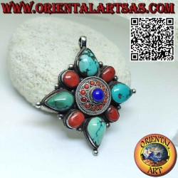 Spektakuläres altes Gao Kalachakra, riesig mit vier Tropfentürkisen plus vier ovalen Korallen und einem zentralen Lapis, umgeben von anderen runden Korallen