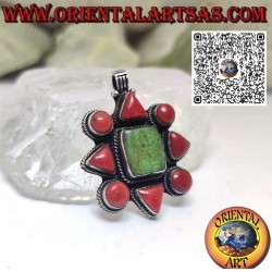 Wunderschöner Silberanhänger mit natürlichem rechteckigem tibetischem Türkis, umgeben von natürlichen dreieckigen und runden Korallen, die abwechselnd eine Windrose bilden