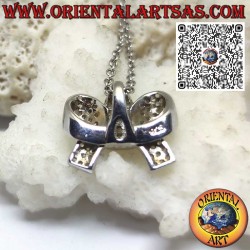 Eleganter und raffinierter bogenförmiger Silberanhänger. Der Rahmen besteht aus poliertem Silber und hat die Form eines zarten Bogendesigns mit weichen, geschwungenen Linien. Die Oberfläche der Schleife ist mit präzise eingesetzten runden Zirkoniasteinen besetzt: Jeder Stein funkelt hell und fängt das Licht aus jedem Winkel ein. Die perfekt angeordneten Zirkonia werten das Design auf und verleihen dem Anhänger einen edlen Glanz und einen funkelnden Effekt. Der Anhänger vereint die Süße des Motivs mit der zeitlosen Eleganz von Silber und Kristallen und eignet sich daher perfekt sowohl für edle Alltagskleidung als auch für besondere Anlässe.