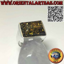 Rechteckiger Ring mit einem großen grünen baltischen Bernstein in einer imposanten einfachen Fassung aus hypoallergenem 925er Silber. Die Oberfläche ist nicht behandelt oder plattiert, so dass sie ihre Schönheit über die Jahre garantiert.