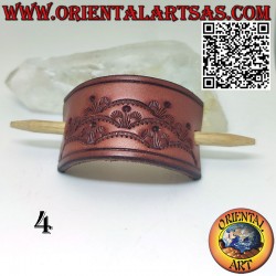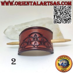 Rechteckige braune Haarspange aus handgestanztem Leder mit Holzstab, hergestellt in einer kleinen Handwerkswerkstatt in Italien