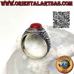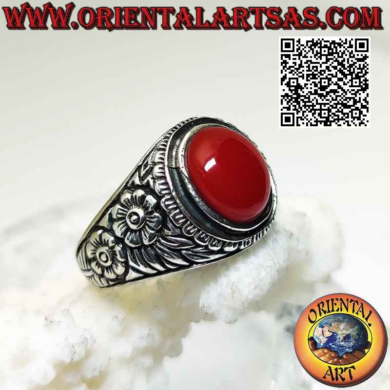 Silberring mit ovalem Karneol-Cabochon und seitlich reliefierter Doppelblume