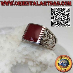 Silberring mit rechteckigem, seitlich gehaktem Karneol und geschwungenem Motiv auf perforiertem Grund
