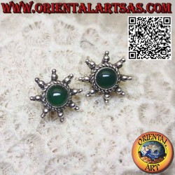 Wunderschöne sonnenförmige Ohrstecker mit Strahlen und grünem Achat in der Mitte, handgefertigt von erfahrenen balinesischen Handwerkern aus hypoallergenem Silber 925. Die Oberfläche ist teilweise poliert und nicht plattiert, was ihre Schönheit und ihren Charme über die Jahre garantiert.