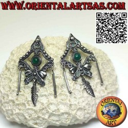 Wunderschöne Ohrläppchen-Ohrringe aus Silber mit rundem grünem Achat, Anhängern und einer Feder im einheimischen Stil, handgefertigt von erfahrenen Handwerkern aus massivem, hypoallergenem 925 ‰-Silber, die Oberfläche ist teilweise brüniert, nicht plattiert, daher garantiert sie ihre Schönheit und ihren Charme über die Jahre hinweg Vergehen. Nickelfrei