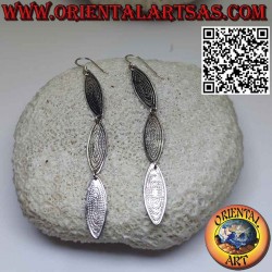 Wunderschöne lange Silberohrringe mit drei gemeißelten elliptischen ovalen Plättchen aus hypoallergenem 925 ‰ Silber. Die Oberfläche ist teilweise brüniert, um die Verarbeitung hervorzuheben und ihre Schönheit über die Jahre hinweg zu gewährleisten. (Ohrringe sind nicht behandelt oder plattiert, sondern aus massivem Silber) Nickelfrei