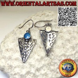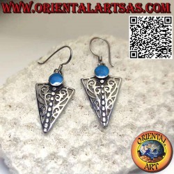 Geschnitzte Dreiecksohrringe mit rundem Türkis aus massivem hypoallergenem 925 ‰ Silber. Die Oberfläche ist teilweise brüniert, um die Verarbeitung hervorzuheben und ihre Schönheit über die Jahre hinweg zu gewährleisten. Nickelfrei, Einzelstück