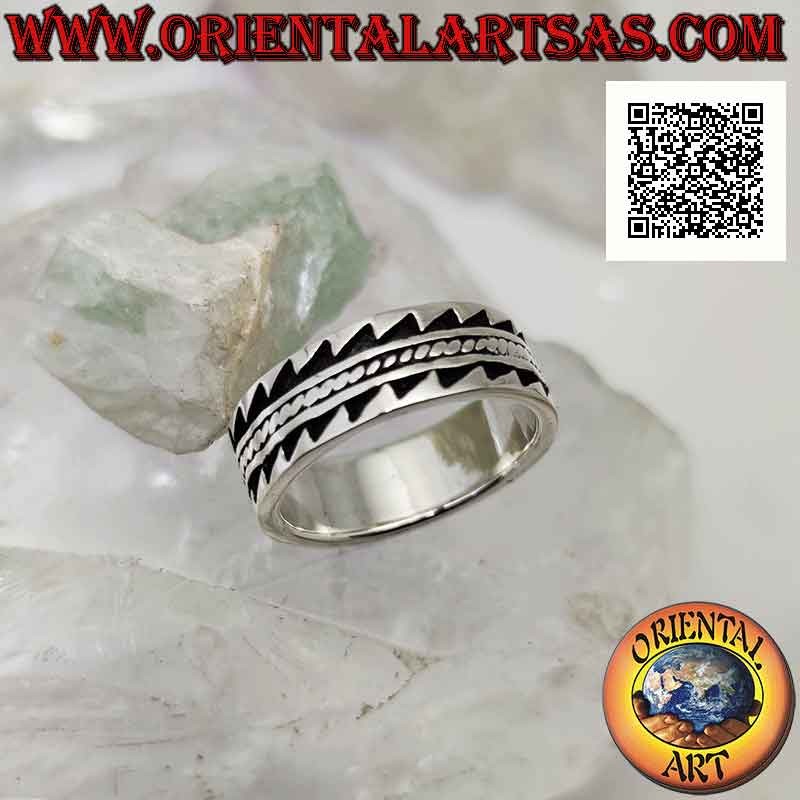 Silberring mit gearbeitetem Band mit gezahnter Basrelief-Dekoration