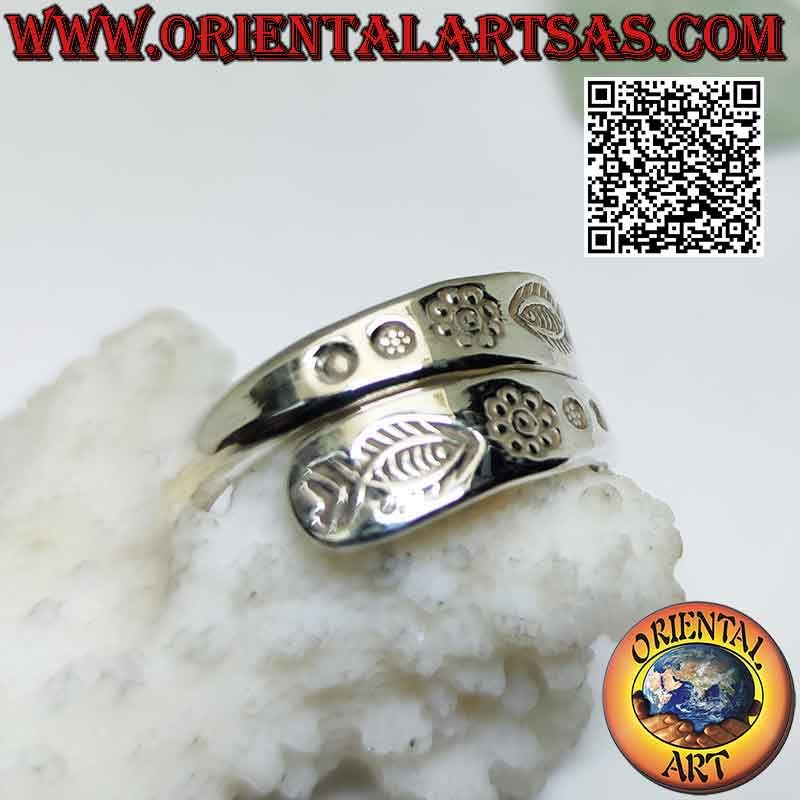 Hypoallergener Ring aus 925er Silber. Die Oberfläche ist teilweise poliert, um die Dekoration hervorzuheben, und sie ist weder behandelt noch plattiert, so dass sie ihre Schönheit über die Jahre garantiert.