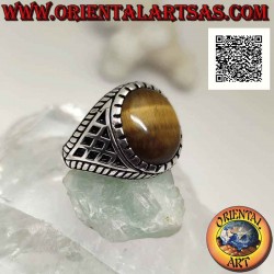 Silberring mit Cabochon-Oval-Tigerauge und seitlich eingravierten Rhomben (A)