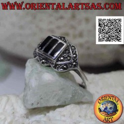 Silberring mit drei Relief-Rechtecken aus Onyx, umgeben von bidirektionalen Pfeilen aus Markasit