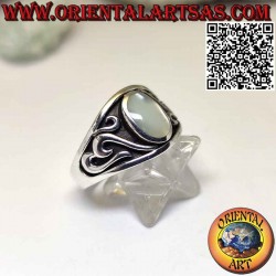 Ring mit ovalem Perlmutt und Reliefverzierungen, die auf einem erschöpften Band geschnitzt sind, das sich bequem um den Finger wickelt, handgefertigt aus massivem hypoallergenem 925 ‰ Silber. Die Oberfläche ist teilweise poliert, um die Verarbeitung hervorzuheben und ihre Schönheit über die Jahre zu gewährleisten. Nickelfrei, Einzelstück
