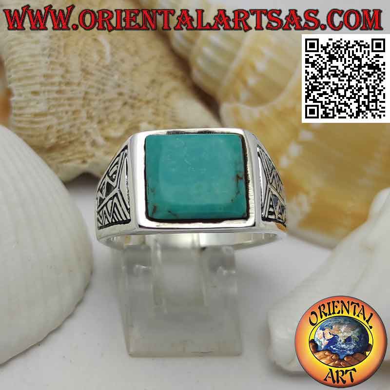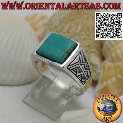 Silberring mit quadratischem Türkis und aztekischer Gravur an den Seiten
