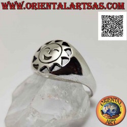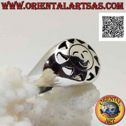 Silberner Ring, geformte Sonne mit lächelndem Gesicht, eingraviert in den perforierten Kreis