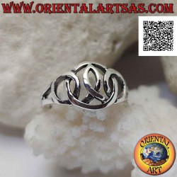 Glatter perforierter Silberring mit dreifach ineinander verschlungenen Kreisen und rosa Schleife im Inneren