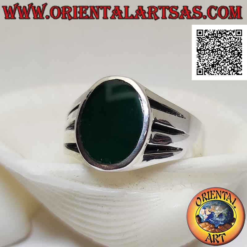 Glatter silberner Ring mit ovalem grünem Achat, bündig mit der Kante und gravierter dreifacher Halbmondlinie