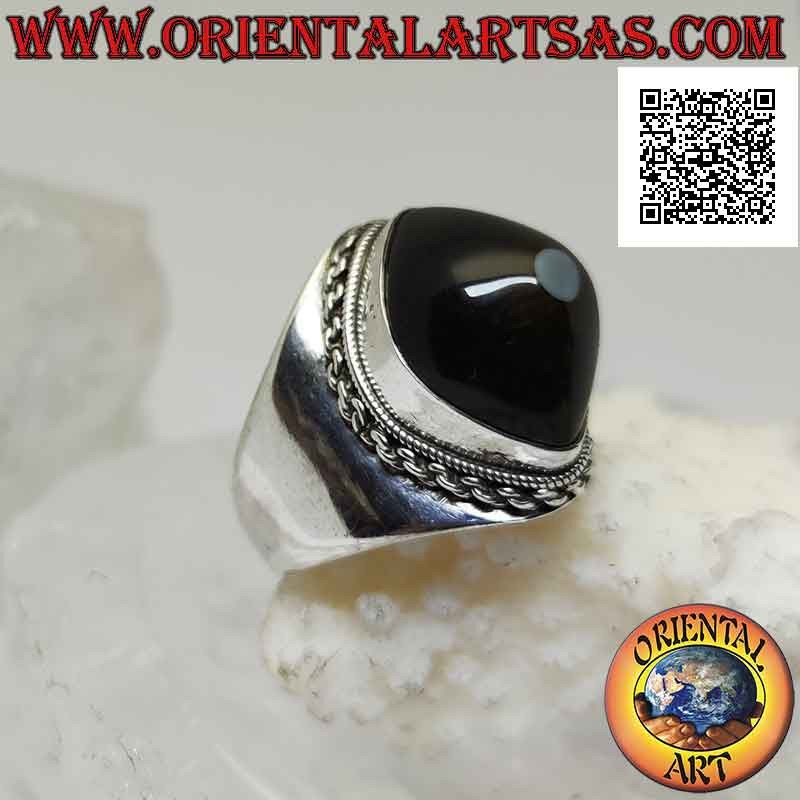 Silberring mit schwarzem Shiva's Eye Achat im Shuttle und Kettenrand auf glatter Fassung (g)