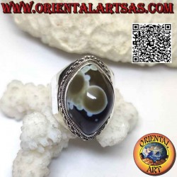 Dieser Achat, genannt Shivas Auge oder Achat des dritten Auges oder Buddhas Achat, hat ein ganz besonderes Aussehen. Es hat tatsächlich einen ähnlichen Umfang wie ein Auge. Es wird verwendet, um Hellsehen zu entwickeln, also um die Zukunft zu sehen, aber auch in anderen Menschen.