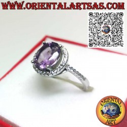 Dieser elegante Ring ist ein raffiniertes Schmuckstück, das mit seiner Zartheit und Brillanz besticht. Gefertigt aus 925er Sterlingsilber, präsentiert er einen prächtigen natürlichen Amethyst im runden oder ovalen Schliff, der innerhalb eines funkelnden Kreises zu "schweben" scheint. Dieser Kreis ist fein mit einer Vielzahl von weißen Zirkonia (CZ) besetzt, die seine Leuchtkraft verstärken und einen faszinierenden Kontrast zum tiefen Lila des Amethysts bilden. Das einzigartige Design verleiht dem Ring ein modernes und gleichzeitig klassisches Aussehen, wodurch er perfekt für jeden Anlass ist, sei es ein besonderes Ereignis oder ein Hauch von Alltags-Eleganz.