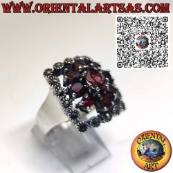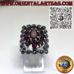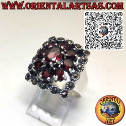 Eleganter Silberring mit zentralem Granat, umgeben von Granaten und Markasiten. Symbol für Leidenschaft und Vitalität, im raffinierten Vintage-Stil.