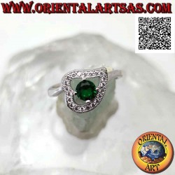 Einzigartiger Damenring aus 925er Silber. Ein runder synthetischer Smaragd ist in ein horizontales Herz eingebettet, das mit funkelnden Zirkonia-Steinen besetzt ist.