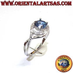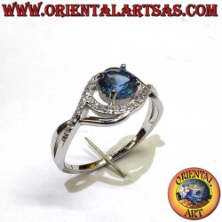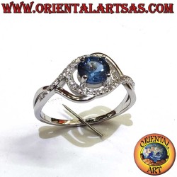 ELEganter 925 Sterlingsilber Ring mit einem tiefblauen runden synthetischen Saphir und einer originellen asymmetrischen Einfassung aus weißen Zirkonen. Die umschließende Anordnung der Zirkone um den Saphir erzeugt dynamische Bewegung und einzigartige Brillanz. Rhodiumbeschichtete, hypoallergene Oberfläche. Ideal für alle, die ein klassisches Stück mit moderner Note suchen.