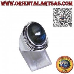 Wunderschöner Silberring mit prächtigem ovalen natürlichen Labradorit besetzt und umgeben, mit einer breiten Bandfassung, handgefertigt aus hypoallergenem massivem 925 ‰ Silber. Nickelfrei
