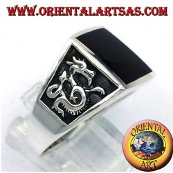 Quadratischer Onyx Drachen Hochrelief Ring 925 Silber - Herrenschmuck Oriental Art