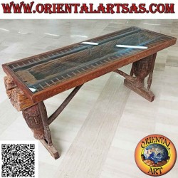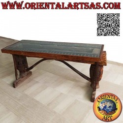 Tisch mit Glasplatte im Kofferraum aus antikem Teakholz recycelt aus landwirtschaftlichen Fahrzeugen (90h x 180x65)