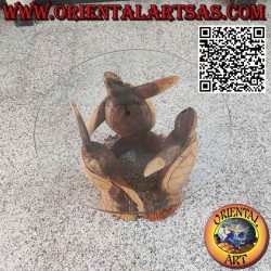 Runder Tisch mit Sockel aus drei handgeschnitzten und geformten Schildkröten aus einem Suar-Holzstamm und runder Ablage aus geschliffenem Kristall.