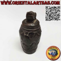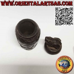 Runde Dose für Medikamente, von Hand eingelegt aus Borneo-Eisenholz Eusideroxylon Zwageri, ausgegraben, geschnitzt und dekoriert von den Dayaks von Borneo, mit Frosch auf der Kappe und Tieren und Blumen in der Dose. Aus einer Privatsammlung in Sarawak, erworben 1983.