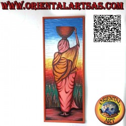 Vertikales handgemaltes Holzbild im Rajasthan-Stil, das „Die Wasserträgerin“ darstellt, ein Symbol für Leben und feminine Anmut. Inklusive Rahmen.