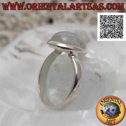 Anillo de plata con piedra lunar arcoíris gota de cabujón en un entorno sencillo y suave