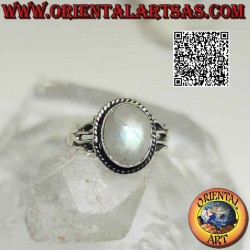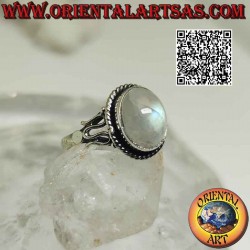 Anillo de plata con cabujón de piedra luna arcoíris ovalado rodeado de entretejido y serpentina a los lados