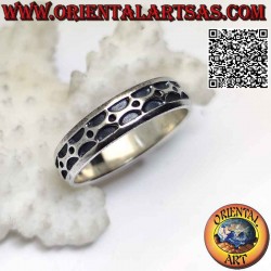 Anillo de plata trabajado con una serie de semicírculos opuestos con grabado profundo y una bola entre ellos.