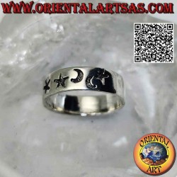 Anillo banda de plata trabajado con luna y estrella alternando con grabado profundo