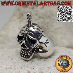 Anillo de plata en forma de calavera sufriente con espada clavada en la calavera