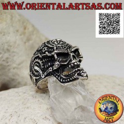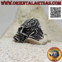 Anillo de plata en forma de calavera satánica trabajado con engranajes y pentáculo grabado en la frente