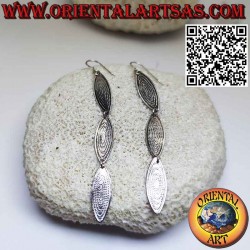 Hermosos aretes largos de plata con tres placas ovales elípticas cinceladas hechos de plata 925 ‰ hipoalergénica. La superficie está parcialmente bruñida para resaltar la mano de obra y garantizar su belleza a lo largo de los años. (Los pendientes no están tratados ni chapados sino en plata maciza) Sin níquel