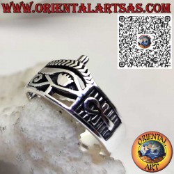 Anillo en plata 925 con Ojo de Horus y símbolos Ankh a los lados. Joya egipcia, símbolo de protección, vida eterna y sabiduría. Perfecto como amuleto espiritual o regalo especial.