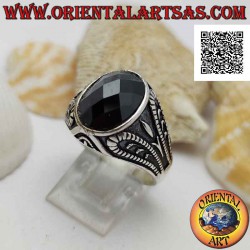 Anillo de plata con espinela ovalada facetada y decoración grotesca oxidado en bajorrelieve