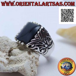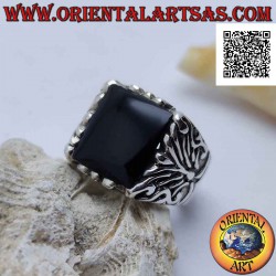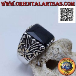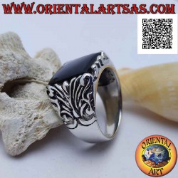 Anillo de plata con ónix cuadrado rodeado de grabados barrocos en un marco imponente
