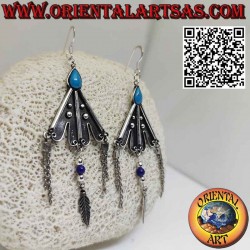Pendientes triangulares de plata con colgantes de turquesas y plumas