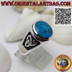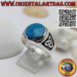Anillo de plata con turquesa redonda a ras con borde en relieve y triquetra en bajorrelieve en los lados