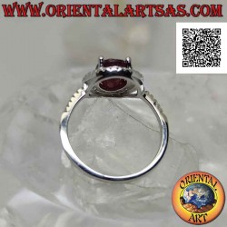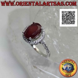 Anillo de plata con rubí sintético ovalado engastado rodeado de circonitas