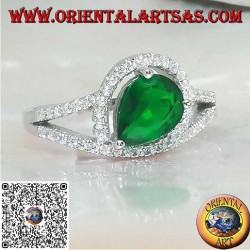 Anillo de plata con esmeralda sintética ovalada engastada rodeada...