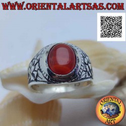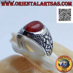 Anillo de plata con cornalina ovalada cabujón y flor de renacimiento en bajorrelieve a los lados