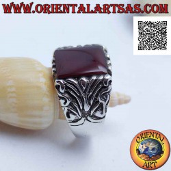 Anillo de plata con cornalina cuadrada rodeada de grabados barrocos en un marco imponente